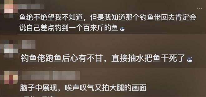 共情钓鱼人的网友应该也是自己有钓鱼的人。如果这个钓鱼人比较理智的话,也许会自我安慰说:“挂底了也没办法”。如果是比较情绪上头的钓鱼人,也许会感觉自己丢失了一条大鱼,于是心有不甘,唉声叹气。