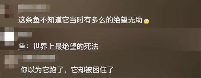 有网友觉得这鱼是真的惨,被挂在水底死活挣脱不开,等到河水的水位下降就只能绝望的死去,网友表示:“世界上最绝望的死亡。”